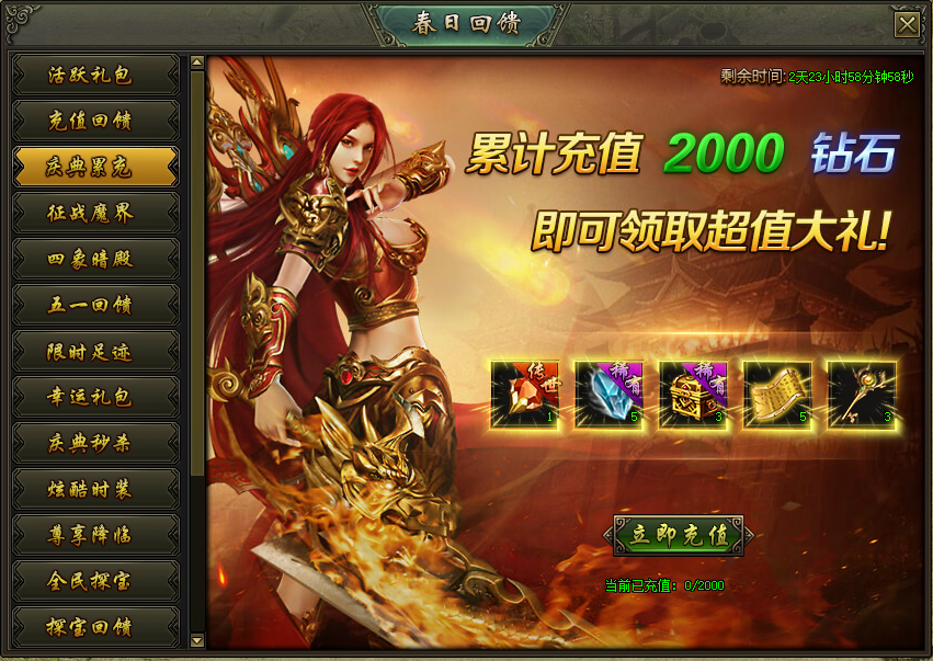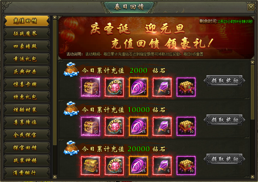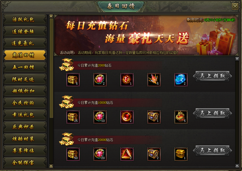 活动说明:活动期间,每天累计充值到指定档位即可领取对应奖励