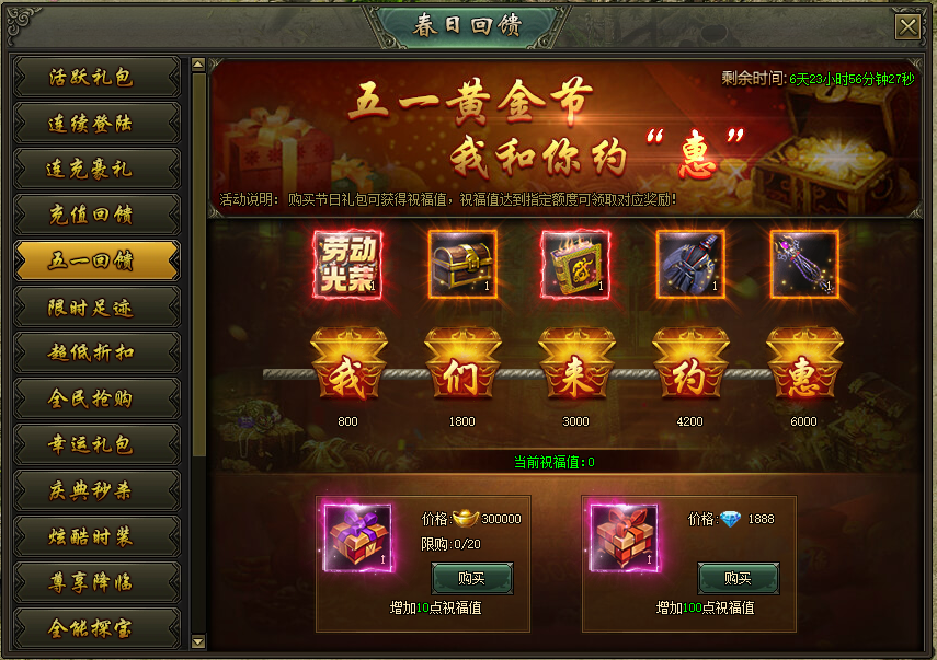 活动说明:活动期间,购买节日礼包可获得祝福值,祝福值达到指定额度可领取对应奖励