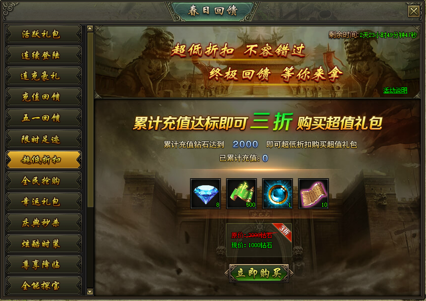 活动说明:活动期间,累计充值达到指定额度,即可购买超低折扣礼包