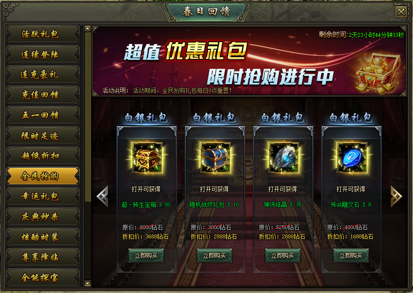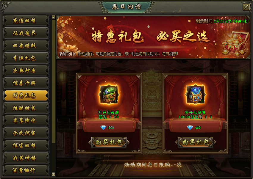 活动说明:活动期间,可购买特惠礼包,每个礼包每日限购1次