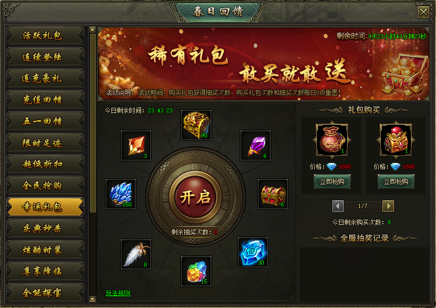 活动说明:活动期间,购买礼包获得抽奖次数,购买礼包次数和抽奖次数每日0点重置。