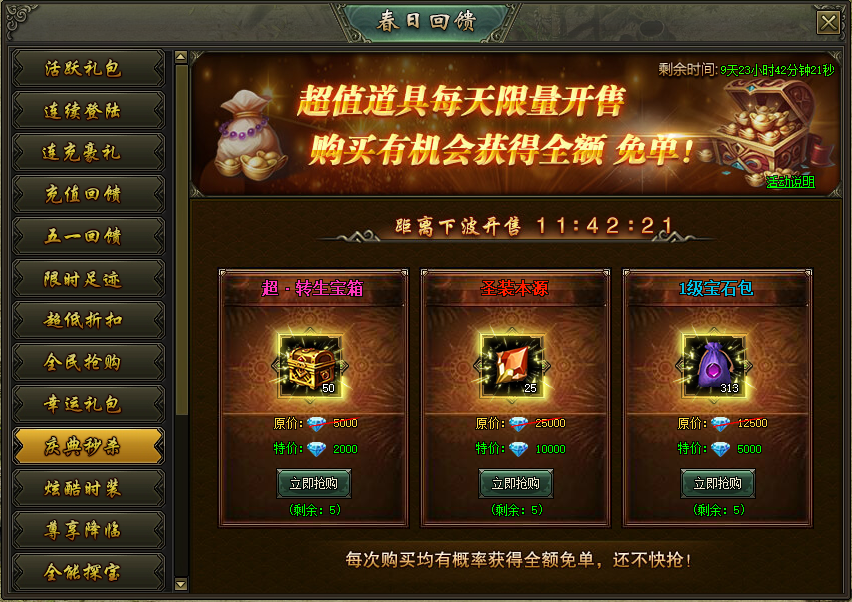 活动说明:活动期间,超值道具每天限量开售,购买就有机会获得全额免单!