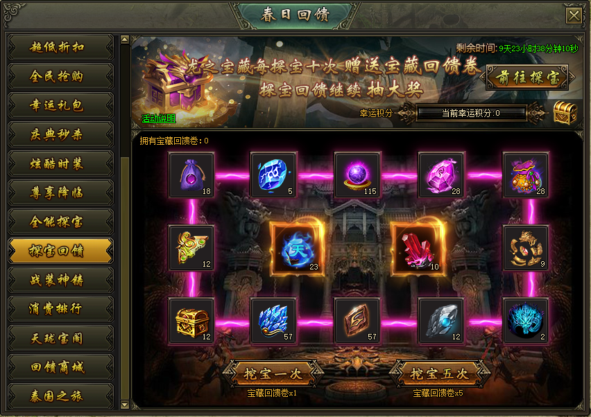 活动说明:活动期间,龙之宝藏每探宝十次赠送一张宝藏回馈卷,可继续在探宝回馈抽大奖
