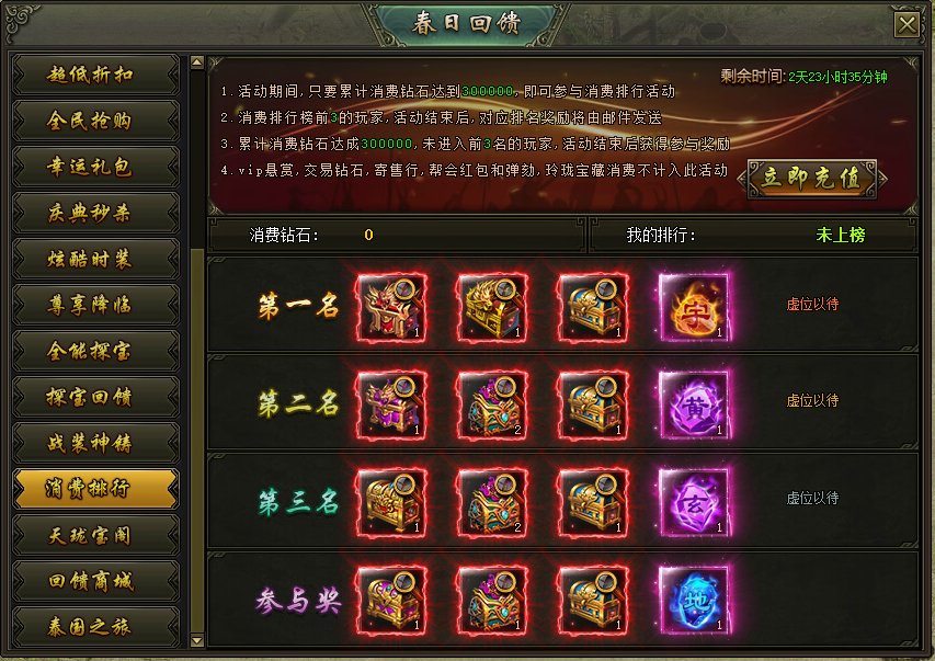 活动说明:活动期间,累计消费达到300000钻石的玩家参与排行,上榜的玩家奖励在活动结束后以邮件的方式进行发放