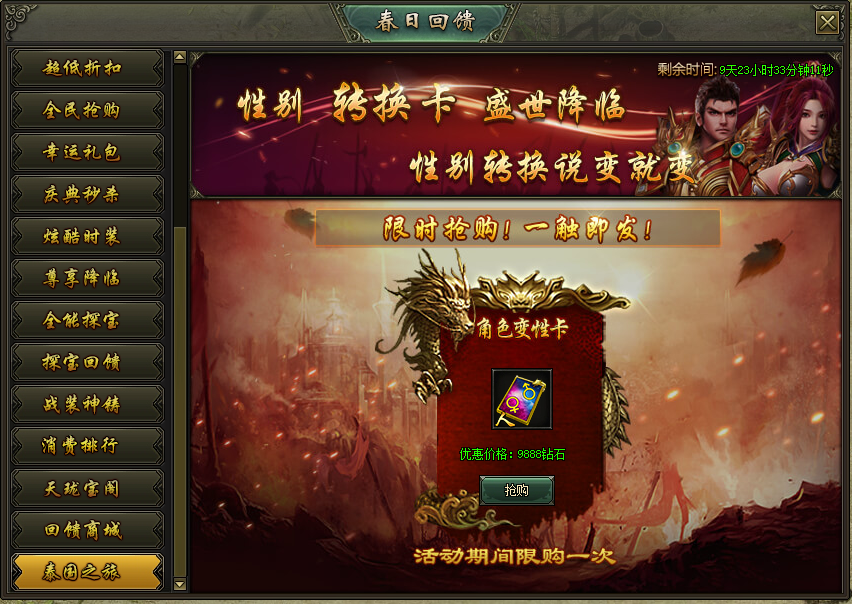 活动说明:活动期间,限时抢购性别转换卡!