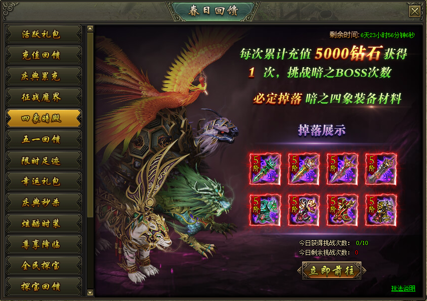 活动说明:活动期间,每累计充值5000钻石可获得1次挑战暗之boss次数,必定掉落暗之四象装备