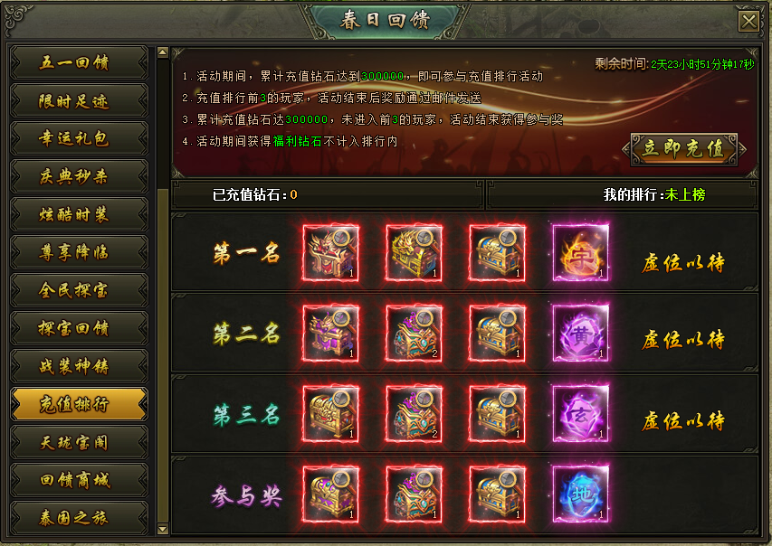 活动说明:活动期间,累计充值达到300000钻石的玩家参与排行,上榜的玩家奖励在活动结束后以邮件的方式进行发放