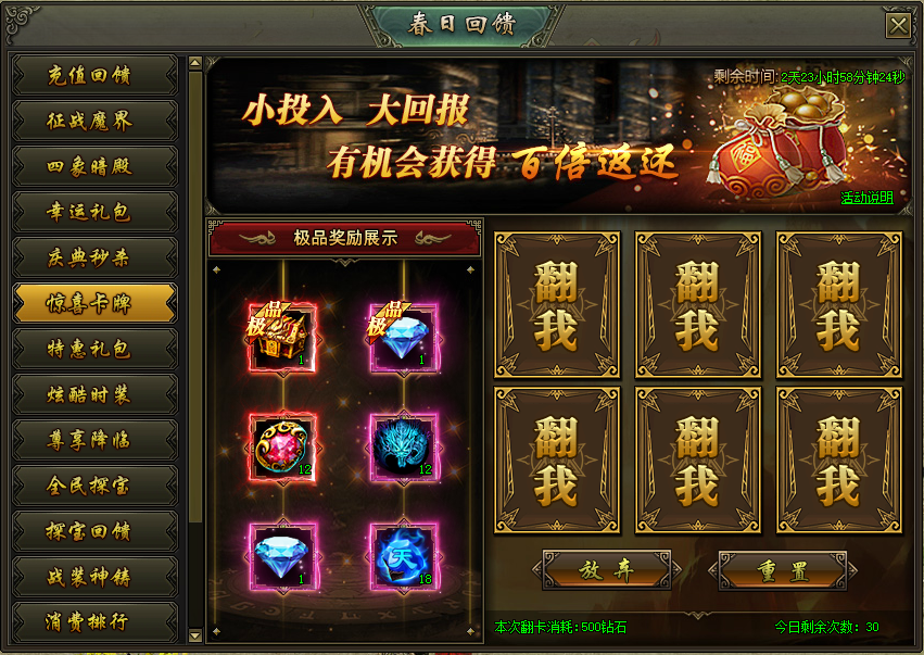 活动说明:活动期间,消耗钻石开启卡牌可获得超级奖励,更有几率翻到超级大奖