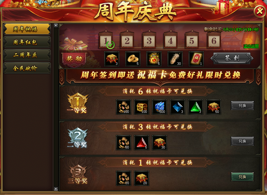 活动说明:活动期间,每日签到获得道具奖励和祝福卡,祝福卡可兑换大量物品