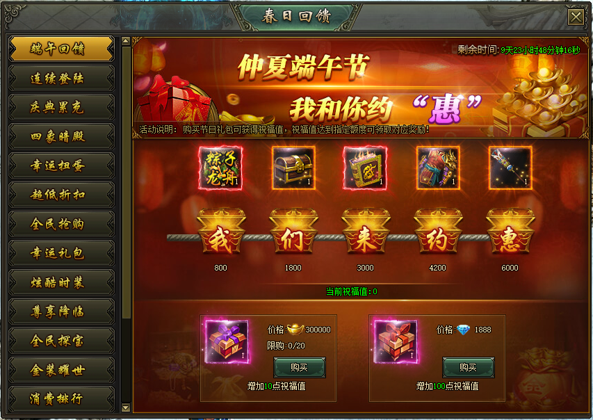 活动说明:活动期间,购买节日礼包可获得祝福值,祝福值达到指定额度可领取对应奖励