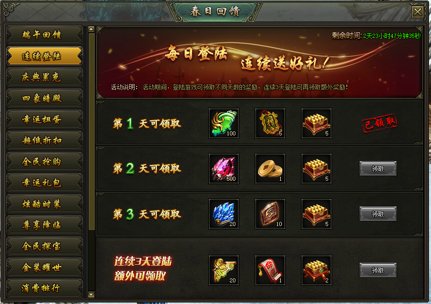 活动说明:活动期间,登陆游戏可领取不同天数的奖励,连续3天登陆可再领取额外奖励