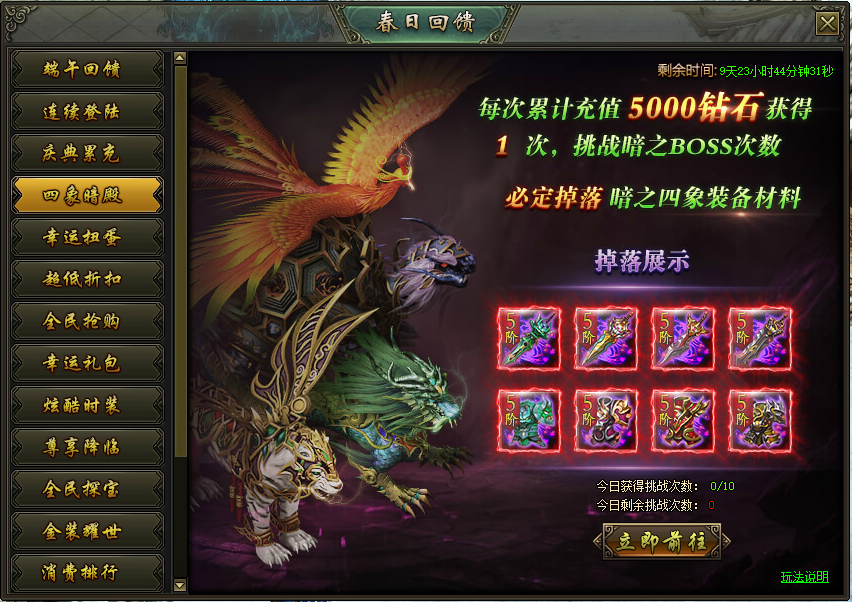 活动说明:活动期间,每累计充值5000钻石可获得1次挑战暗之boss次数,必定掉落暗之四象装备