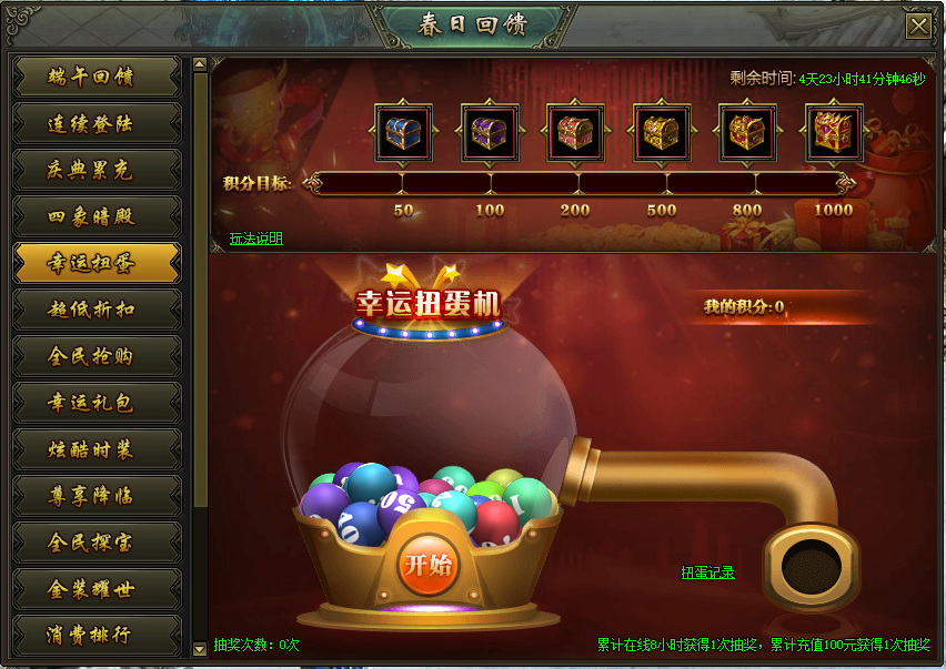 活动说明:活动期间,累计在线和累计充值均可获得抽奖次数,抽取之后获得积分奖励并可进行积分排行获得排行奖励