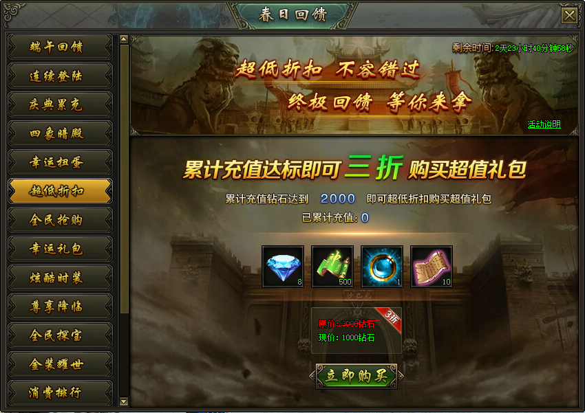 活动说明:活动期间,累计充值达到指定额度,即可购买超低折扣礼包
