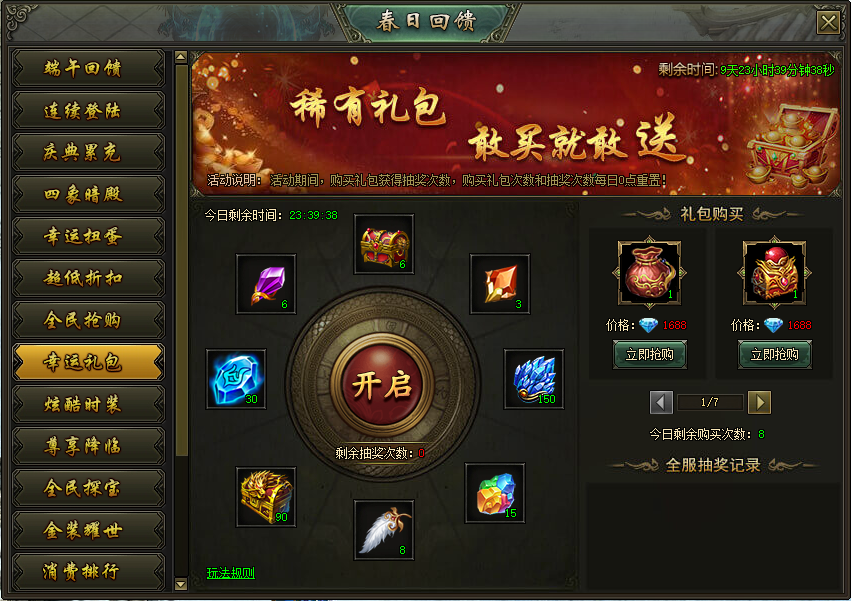 活动说明:活动期间,购买礼包获得抽奖次数,购买礼包次数和抽奖次数每日0点重置。