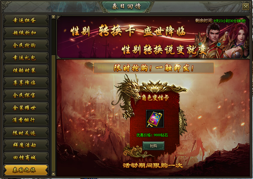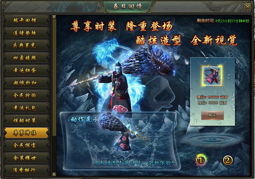 活动说明:活动期间,绝版时装限时出售,炫酷拉风外型、超高属性都在这里!