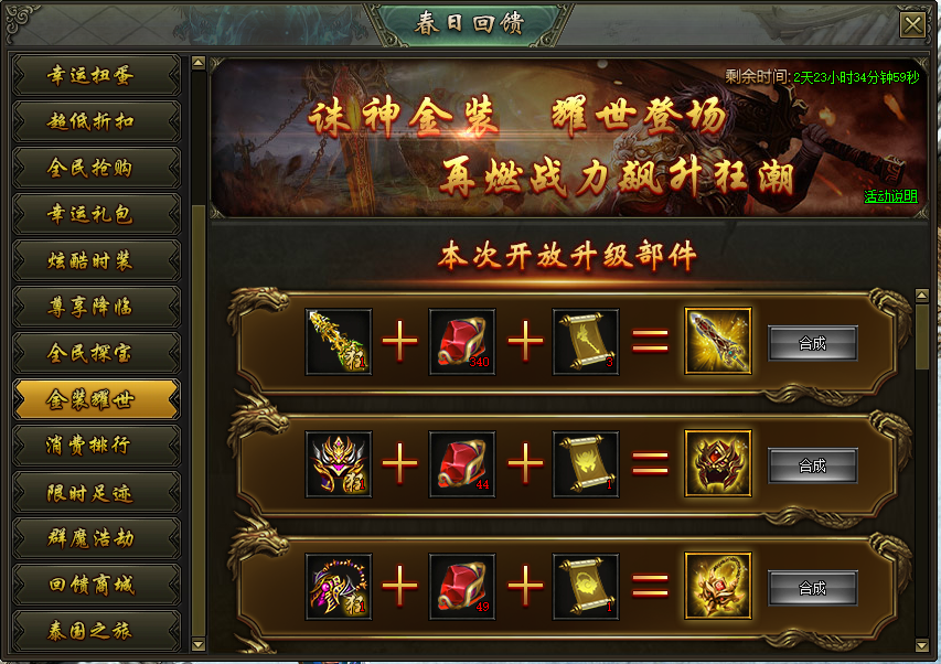 活动说明:活动期间,诛神金装耀世登场,穿戴之后战力飙升