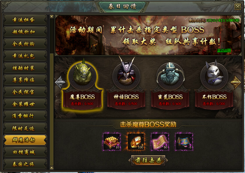 活动说明:活动期间,累计击杀指定类型BOSS,可领取超值奖励!
