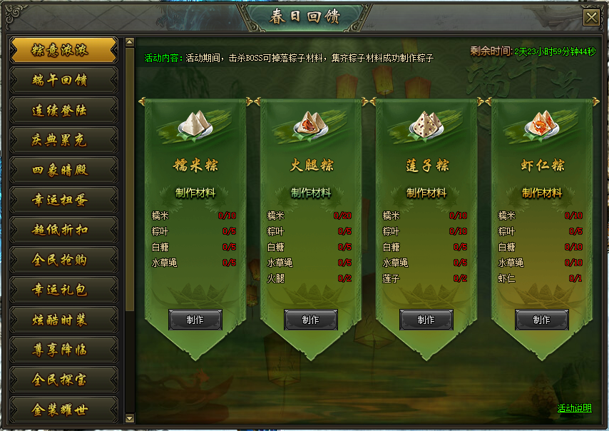 活动说明:活动期间,击杀BOSS可掉落粽子材料,集齐粽子材料成功制作粽子