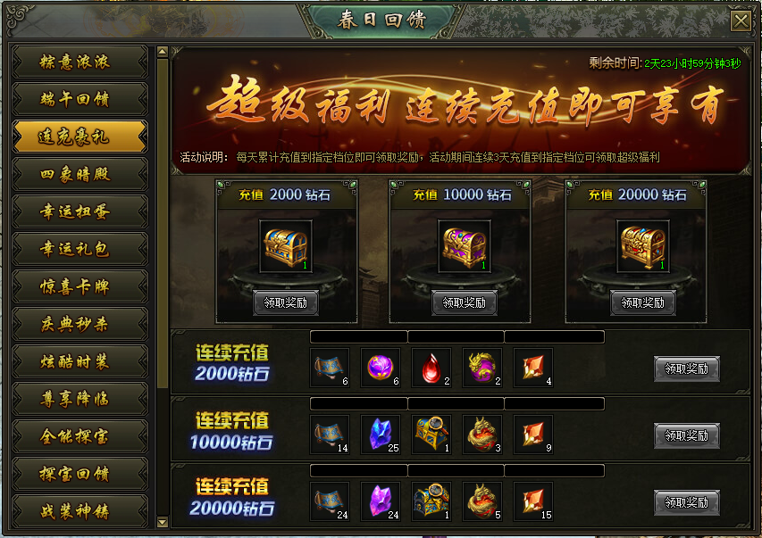活动说明:活动期间,每天累计充值到指定档位即可领取对应奖励,连续充值3天可领取连充大奖