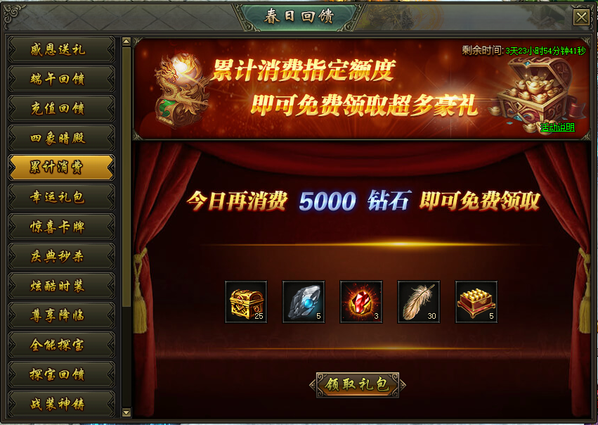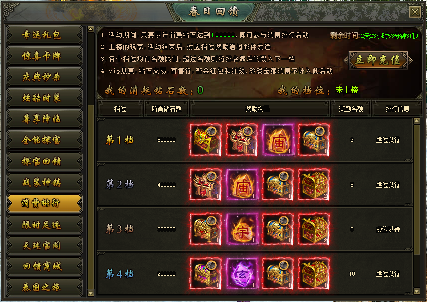 活动说明:活动期间,累计消费达到100000钻石的玩家参与排行,达到对应档位的玩家奖励在活动结束后以邮件的方式进行发放