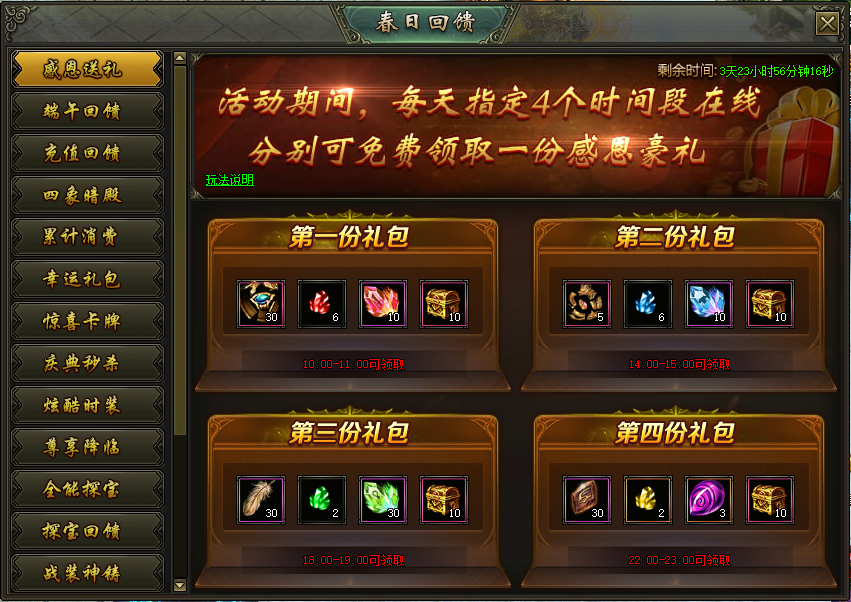 活动说明:活动期间,指定时间段在线即可领取对应奖励