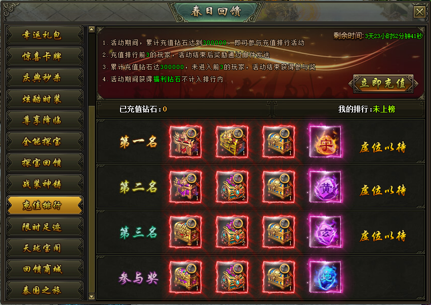 活动说明:活动期间,累计充值达到300000钻石的玩家参与排行,上榜的玩家奖励在活动结束后以邮件的方式进行发放