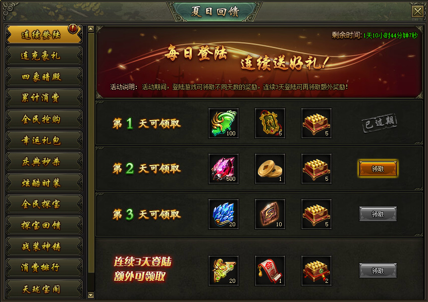 活动说明:活动期间,每天登陆游戏即可领取奖励,连续3天登陆更可获得额外奖励