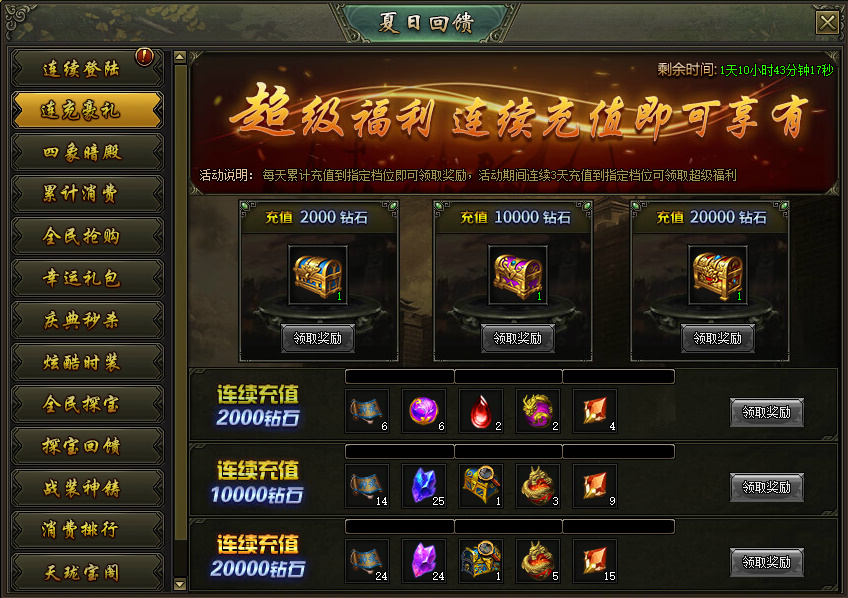 活动说明:活动期间,每天累计充值到指定档位即可领取奖励,活动期间连续3天充值到指定档位即可领取超级福利