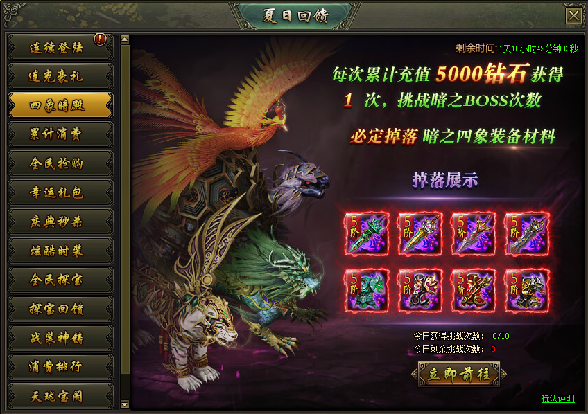 活动说明:活动期间每累计充值5000钻石即可获得1次四象暗殿挑战次数,必定掉落暗之四象装备