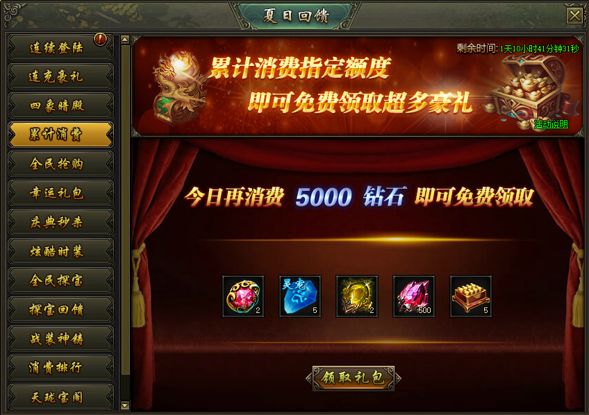 活动说明:活动期间内累计消费钻石数达到指定额度可领对应奖励