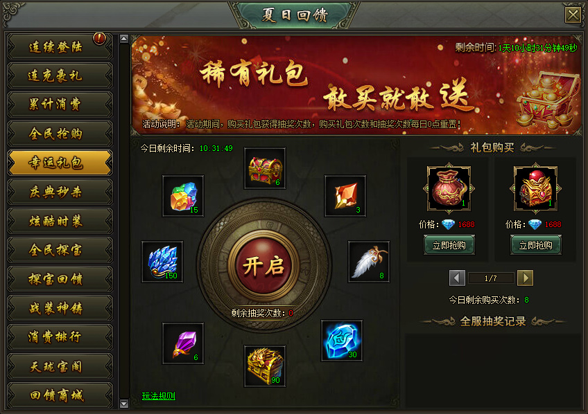 活动说明:活动期间,购买礼包即可获得抽奖次数,购买礼包次数和抽奖次数每日0点重置