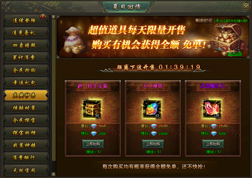 活动说明:超值道具每天限量开售,购买就有机会获得全额免单
