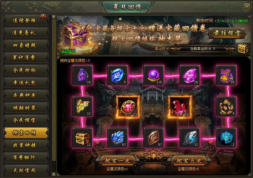 活动说明:活动期间,龙之宝藏每探宝十次赠送1个宝藏回馈卷,可继续抽大奖