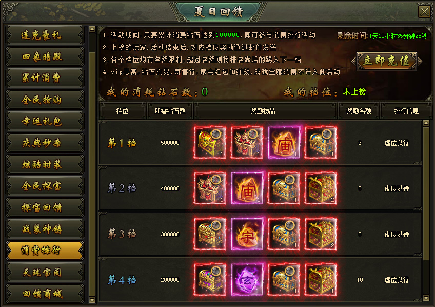 活动说明:活动期间,累计消费达到100000钻石的玩家参与排行,达到对应档位的玩家奖励在活动结束后以邮件的方式进行发放