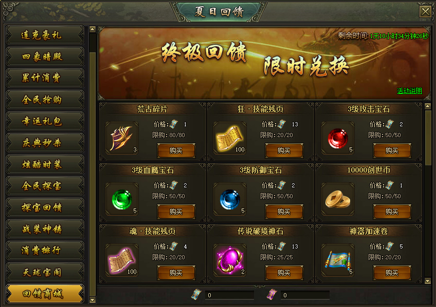 活动说明:活动期间,可使用充值回馈卷和消费回馈卷兑换大量奖励