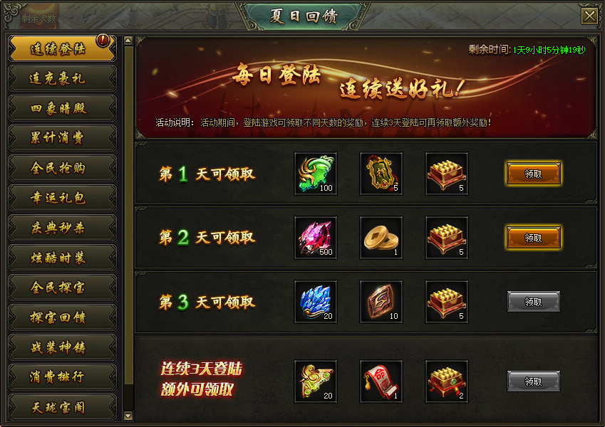 活动说明:活动期间,每天登陆游戏即可领取奖励,连续3天登陆更可获得额外奖励