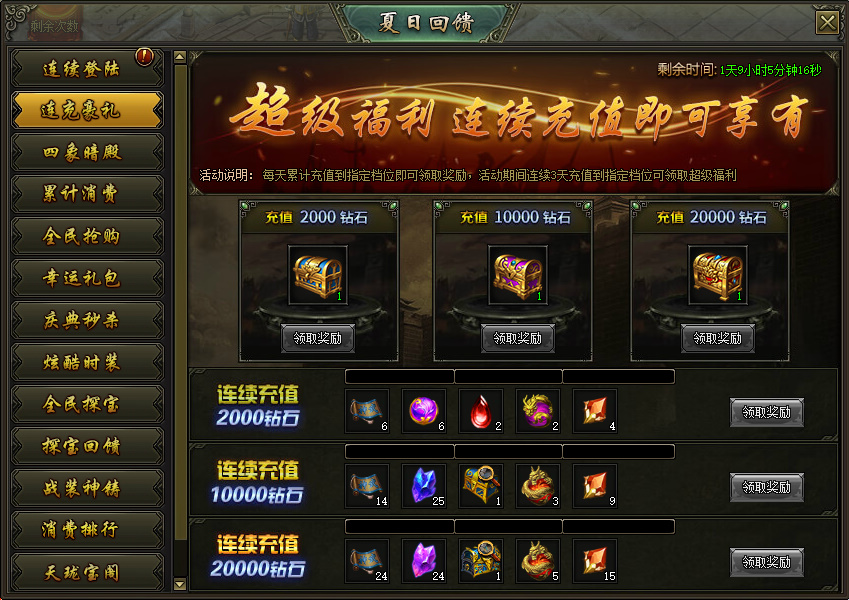 活动说明:活动期间,每天累计充值到指定档位即可领取奖励,连续3天充值到指定档位即可领取超级奖励