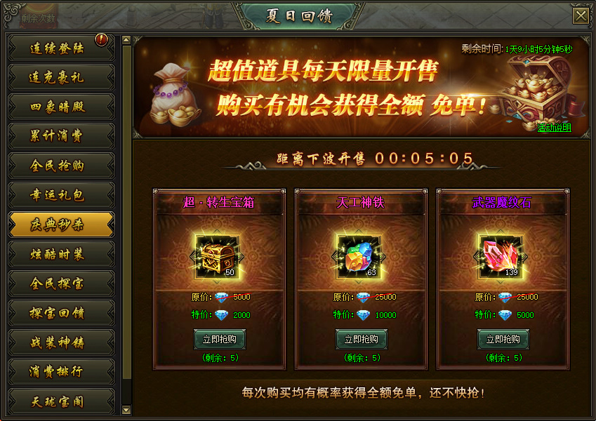 活动说明:超值道具每天限量开售,购买就有机会获得全额免单