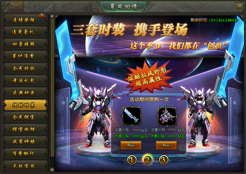 活动说明:活动期间,绝版时装限时出售,炫酷拉风外型、超高属性都在这里!