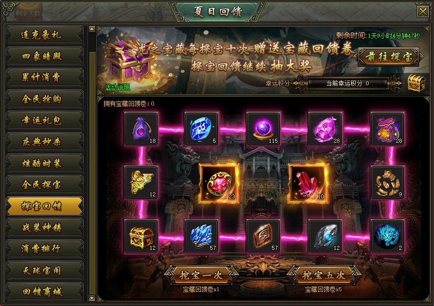活动说明:活动期间,龙之宝藏每探宝十次赠送1个宝藏回馈卷,可继续抽大奖