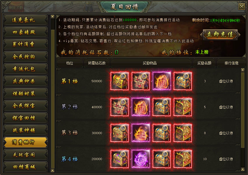 活动说明:活动期间,累计消费达到100000钻石的玩家参与排行,达到对应档位的玩家奖励在活动结束后以邮件的方式进行发放