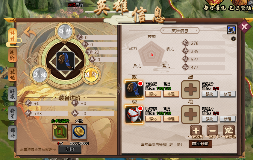 进阶将消耗装备碎片与金币,来提升装备的属性与装备的最大等级上限。