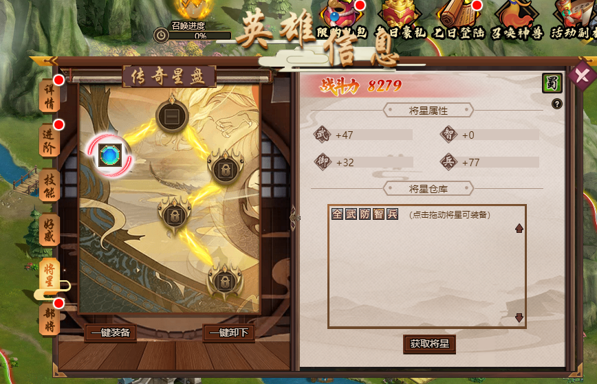 将星的属性将根据英雄的星图有额外的属性加成,距离核心将星越远的普通将星,属性增幅的越多。