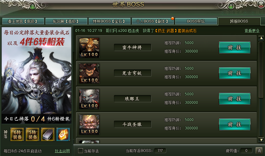 在任何区域内每隔一段时间都将消耗一定疲劳值,疲劳值消耗完则会被强制踢出BOSS场景,玩家可以通过击杀BOSS、其他玩家来获得疲劳值。跨服BOSS场景中一共有7只BOSS,每20分钟刷新一次。跨服BOSS场景中默认为家族模式。掉落归属与最后一击的玩家。跨服世界BOSS每天必定掉落大量套装合成石以及4件六转装备。