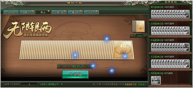 每次摸金需要消耗一张摸金券,摸金券可以在商城直接购买,也可在游戏里的不同任务系统,通过完成任务获取。摸金可以选择一张一张的抽取或者十连抽,每抽取一张牌都有不同的银两奖励。