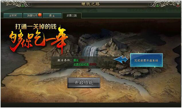 武尊之路内的BOSS云集,每一只BOSS都将有非常强的实力,只有真正的勇者才能过关斩将的将一个一个的人头收入囊中,当然了,闯关奖励也是极为重要,武尊之路的奖励也继金钱鼠、跑腿任务后的第三个银两产出源泉!产出量会随着BOSS的实力提高而提高!有多少斤两,就拿多少银两则是这个系统的核心口号!