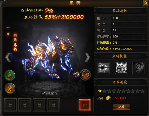 系统说明:坐骑系统是游戏的核心系统之一,除了炫酷无比的骑乘体验外,坐骑系统还能为玩家带来致命一击的效果,大概率给BOSS造成巨额伤害。在角色前期装备未成形时,是玩家快速击杀BOSS的主要手段。此外,坐骑觉醒之后,更是能将致命一击的触发概率提升100%,光速击杀BOSS不是梦。