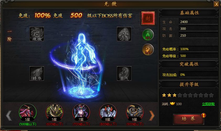 系统说明:无敌系统是游戏的核心系统之一,该系统可以让玩家免疫BOSS的伤害。在角色不够强大,BOSS伤害太高的时候,让玩家能够安心的站撸BOSS。无敌系统的升级材料为元宝,元宝的获取主要来自于装备献祭,极限挑战,兑换