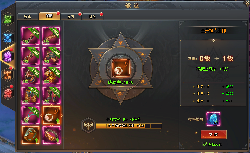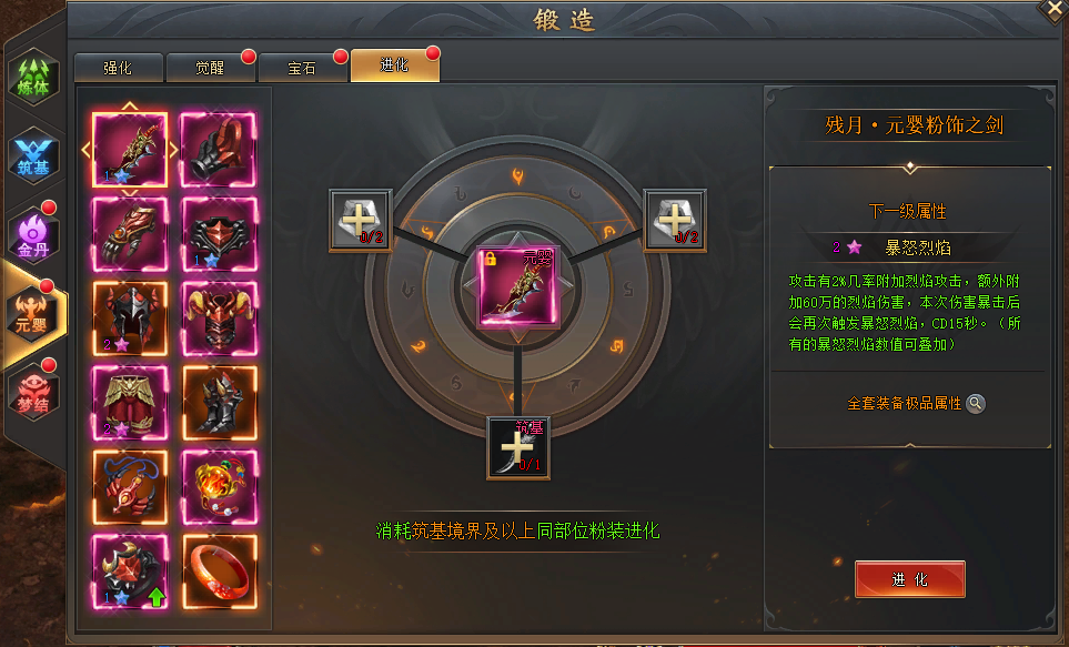 装备锻造 1.1 入口 l 1. 玩家等级达到105级,即可在主界面下方功能栏内点击进入 l 2. 随着玩家境界等级提升,将逐步开放各种锻造玩法 l 3. 只有境界装备的基础部位可以进行锻造,其余装备不能进行锻造,基础部位指: l 武器、手套、护腕、戒指、头盔、腰带、铠甲、手镯、玉佩、项链、护腿、鞋子 1.2 强化 l 【材料消耗】消耗强化石对装备进行强化,随着强化等级提升,强化所需要的材料及数量也会提升。 l 【强化属性】强化可对部位增加额外的基础属性(每套境界装备的强化属性互相独立,不叠加继承) l 【强化套】全身每件装备达到一定强化等级后,可激活强化大师,获得更强属性。 l 【强化上限】每一套的境界装备强化的上限不同,随着境界越高,强化上限越高 1.3 觉醒 l 【觉醒消耗】消耗觉醒石,可以对装备进行觉醒,觉醒有一定的成功率,随着觉醒等级的提升,觉醒成功率会逐渐下降 l 【觉醒属性】 觉醒增加的属性与装备基础属性类型一致(每套境界装备的觉醒属性互相独立,不叠加继承) l 【觉醒大师】全身装备觉醒达到一定等级后,可激活觉醒大师属性,获得更特殊更强的属性 l 【觉醒上限】每一套的境界装备觉醒的上限不同,随着境界越高,觉醒上限越高 1.4 宝石 l 【宝石镶嵌】每个部位只能镶嵌特定类型的宝石,比如:武器只能镶嵌攻击宝石;(每套境界装备的宝石属性互相独立,不叠加继承) l 【宝石格子】每个部位有4个宝石格子和1颗特殊宝石 l 【特殊传奇宝石】当4个宝石格子的宝石都升到当前境界的宝石升级上限时,激活开启中间特殊宝石,获得传奇宝石属性 l 【宝石升级/替换】可以使用低级宝石合成宝石,或者使用高级宝石直接替换 l 【宝石等级上限】每一套的境界装备宝石等级上限不同,随着境界越高,等级上限越高 1.5 进化 l 【进化消耗】 n 消耗进化石(虚空石)和同部位粉色装备,可以对装备进化,进化后可以获得装备的特殊词条属性或者特殊技能 n 进化消耗的粉色装备需要满足一定的境界要求,比如当前境界是元婴,可以使用筑基以上同部位粉装进化 l 【进化属性】 n 进化属性星级最高为5星,可通过消耗材料进化,提升属性星级 n 每套境界装备的进化属性不同,属性互相独立,不叠加继承